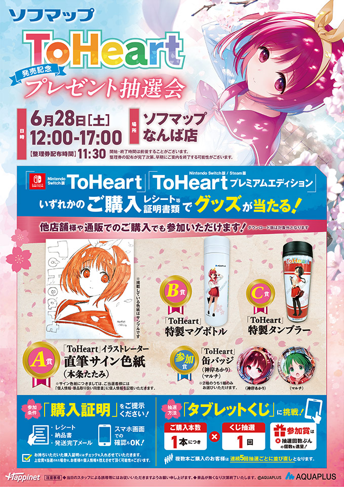 - Nintendo Switch版 『ToHeart』ダウンロード版やSteam版 『ToHeart』ダウンロード版は対象外となります。予めご了承ください。