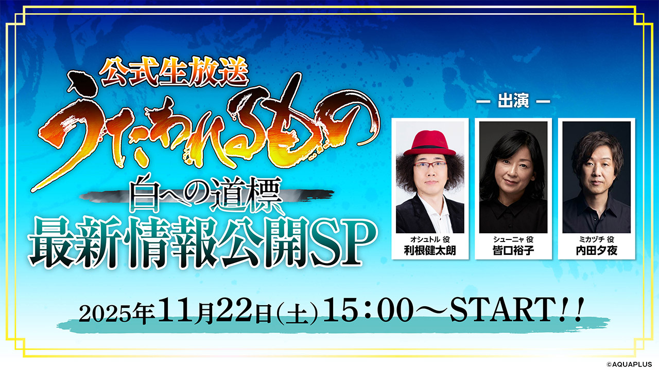 2025年11月22日(土)に「『うたわれるもの 白への道標』公式生放送 最新情報公開SP」および「『うたわれるもの ロストフラグ』公式生放送 6周年記念スペシャル!」の2番組を同日配信いたします。