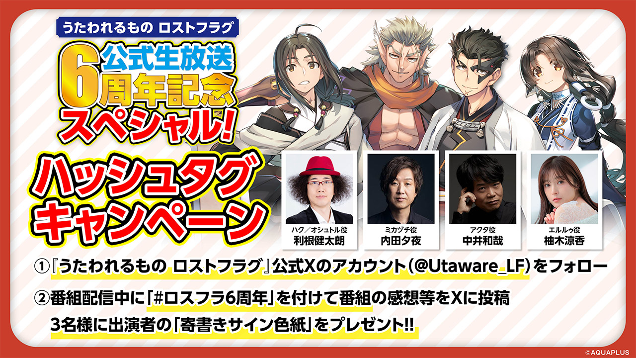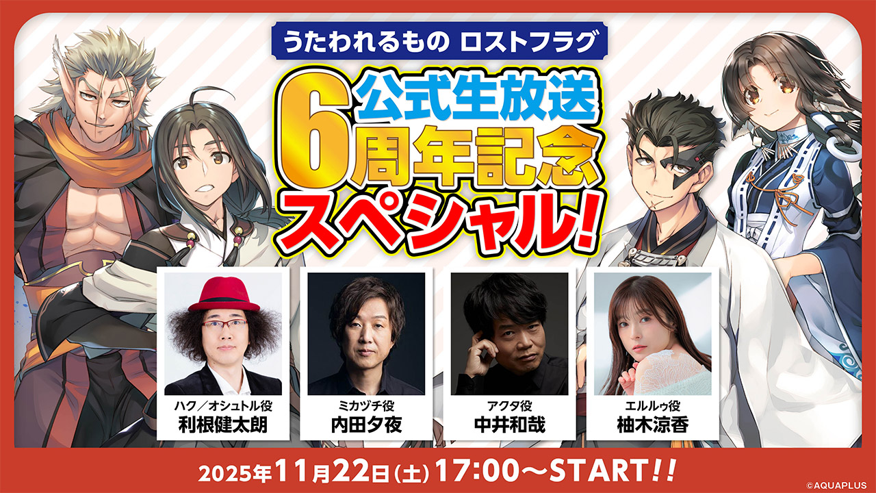 YouTubeのアクアプラス公式チャンネルにて、2025年11月に6周年を迎える『うたわれるもの ロストフラグ』を記念した公式生放送番組を配信いたします。豪華な出演者の方々による楽しいトークや最新情報等をお届けいたします。